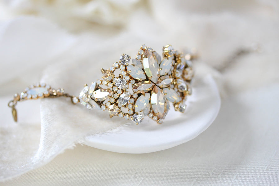 The Madelynn Bracelet by Treasures by Agnes is a breathtaking heirloom-inspired design crafted for brides who love romantic, vintage sparkle. Handset in an antique gold finish, this statement bracelet features an exquisite blend of Austrian crystals in white opal, golden shadow and clear tones for a multidimensional glow.