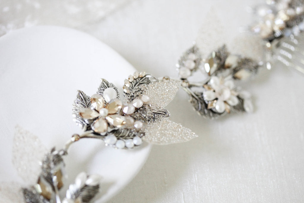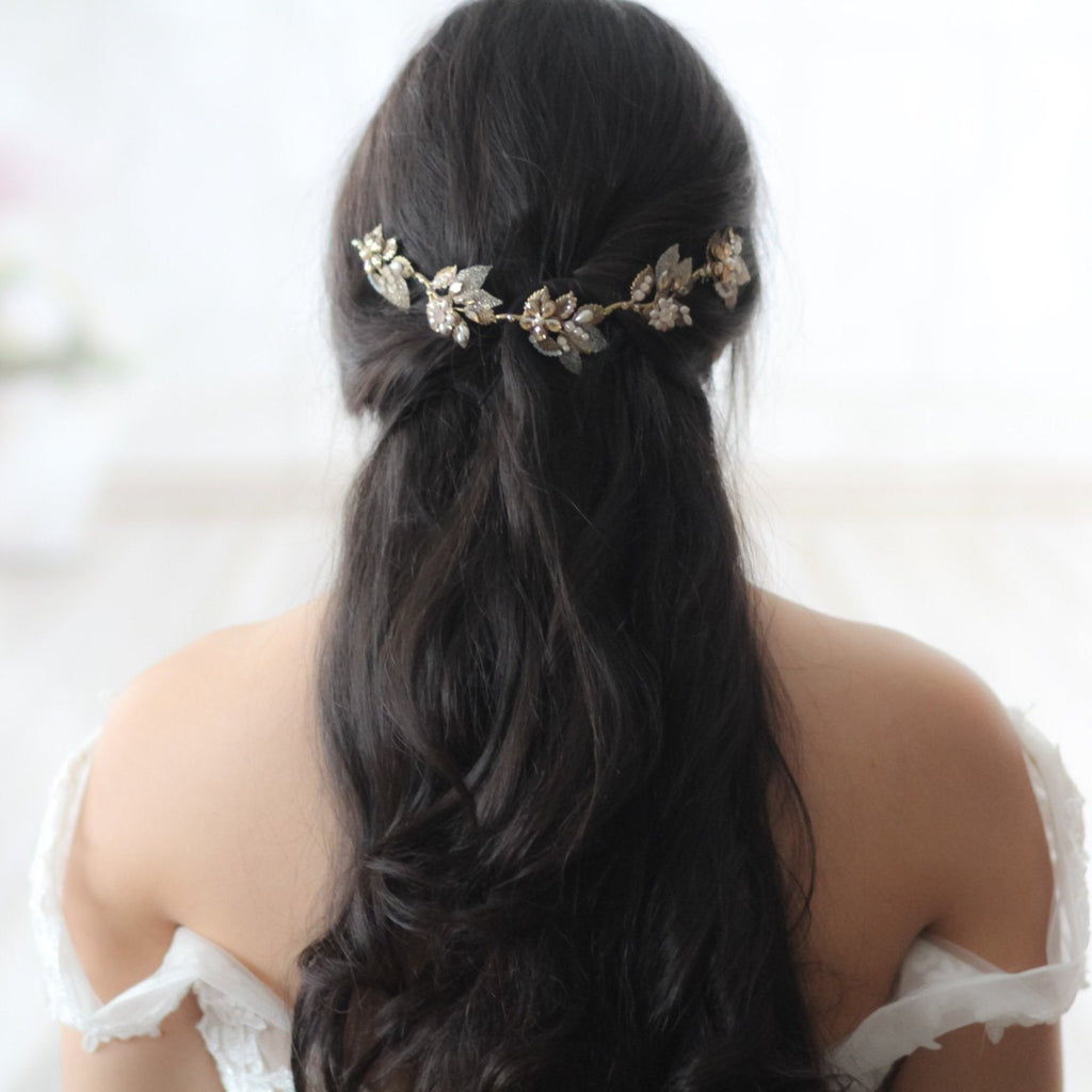 Handcrafted Antique gold Bohemian style Bridal hair vine is created completely by hand and studded with layers of Premium European crystals and pearls. A romantic, bohemian style hair vine perfect for any hair style.