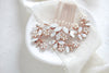 Delicate, feminine & floral, this hair comb has it all. Our popular EVA Rose gold Bridal hair comb with white opal crystals and pearls is handcrafted with flowers, delicate pearls & shimmering crystals.