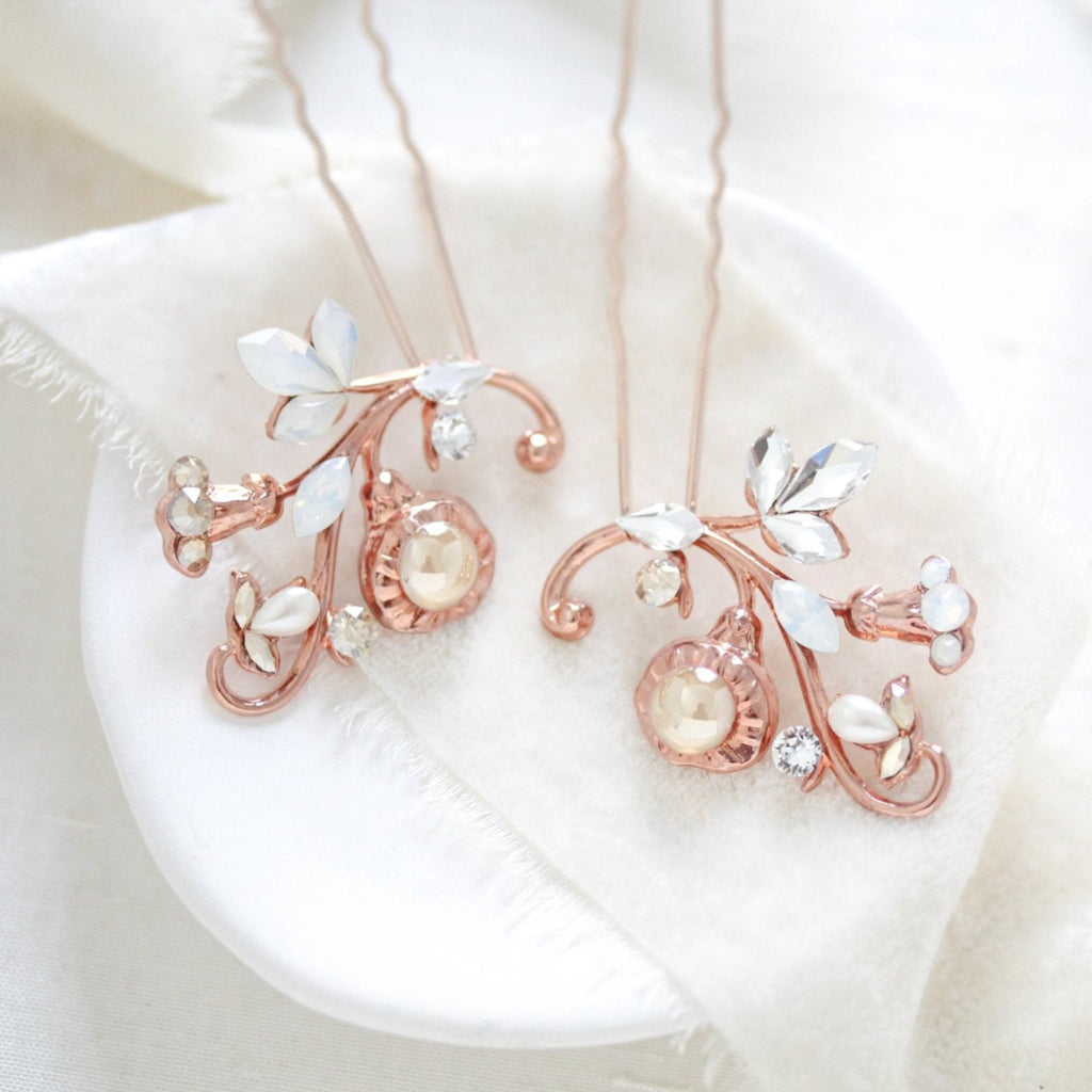 Captivating & dreamy, our Remi Rose gold bridal hair pin is the perfect nature inspired hair pin combining pearl, crystal & metal leaf elements in a feminine, floral design.