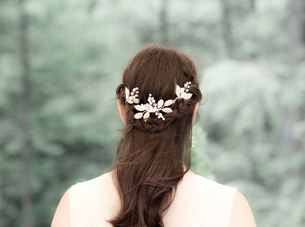 Calling all boho brides, this captivating three piece crystal bridal hair comb set is made just for you! Adorned with brass leaves, freshwater pearls and clear crystals, this  set gives off gorgeous bohemian vibes!