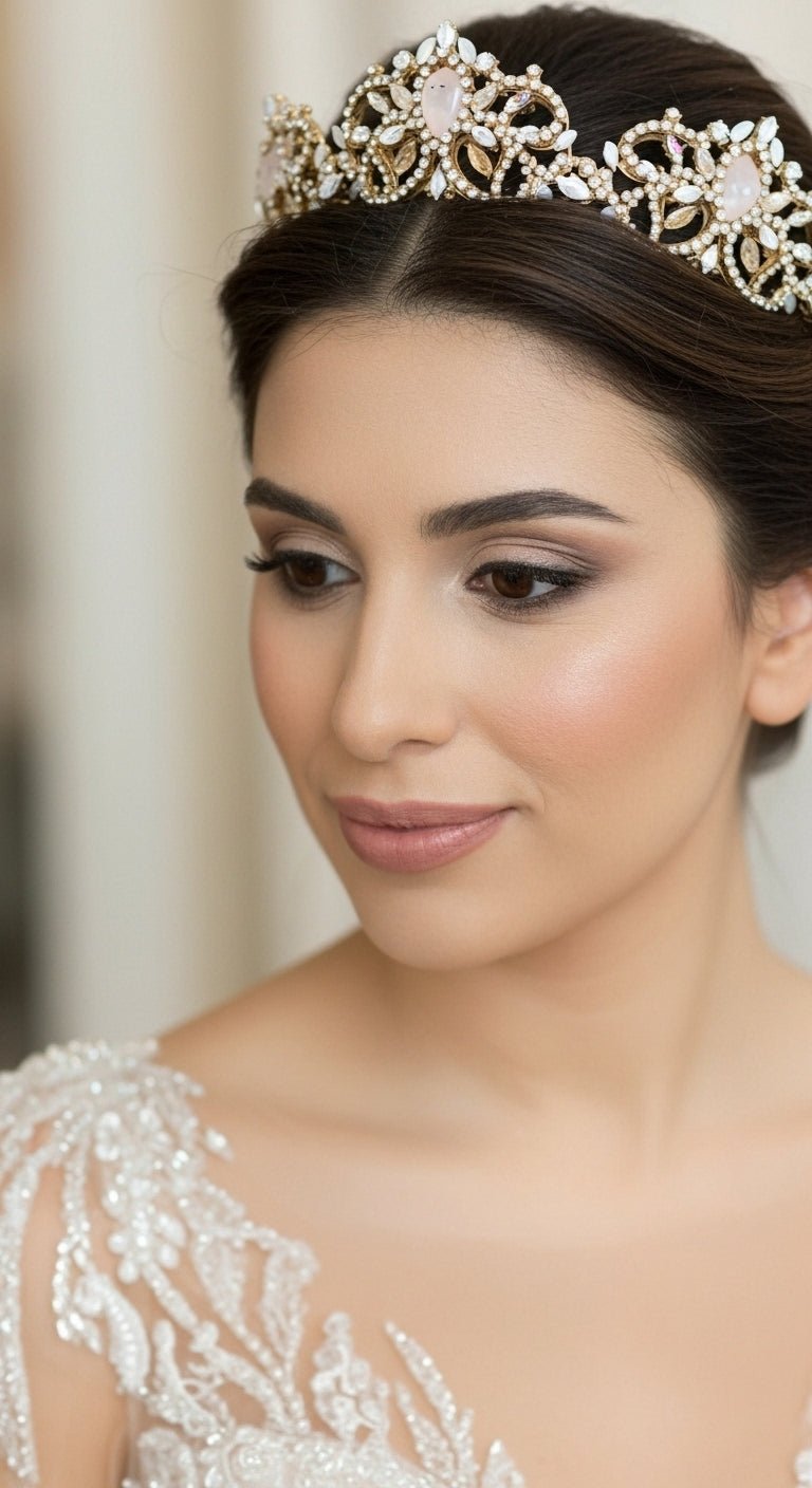 The Celeste Tiara by Treasures by Agnes is a breathtaking heirloom design crafted for the bride who loves rich detail and romantic sparkle. Hand-set in an antique gold finish, this ornate tiara features an exquisite blend of Austrian crystals in golden shadow, ivory cream, white opal, and clear tones, accented with soft pearl details for a luminous, vintage-inspired glow.