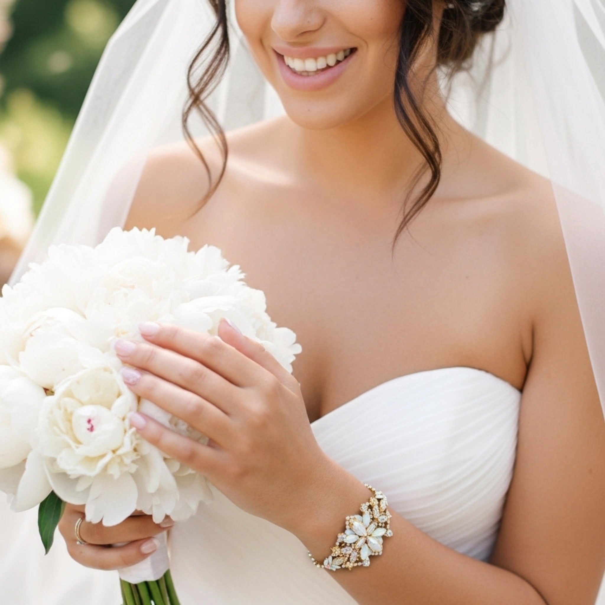 Its cluster motif wraps gracefully around the wrist, creating a bold yet refined silhouette that photographs beautifully from every angle. Fully adjustable, lightweight, and comfortable, the Madelynn Bracelet adds a touch of timeless luxury to both classic and modern bridal gowns.