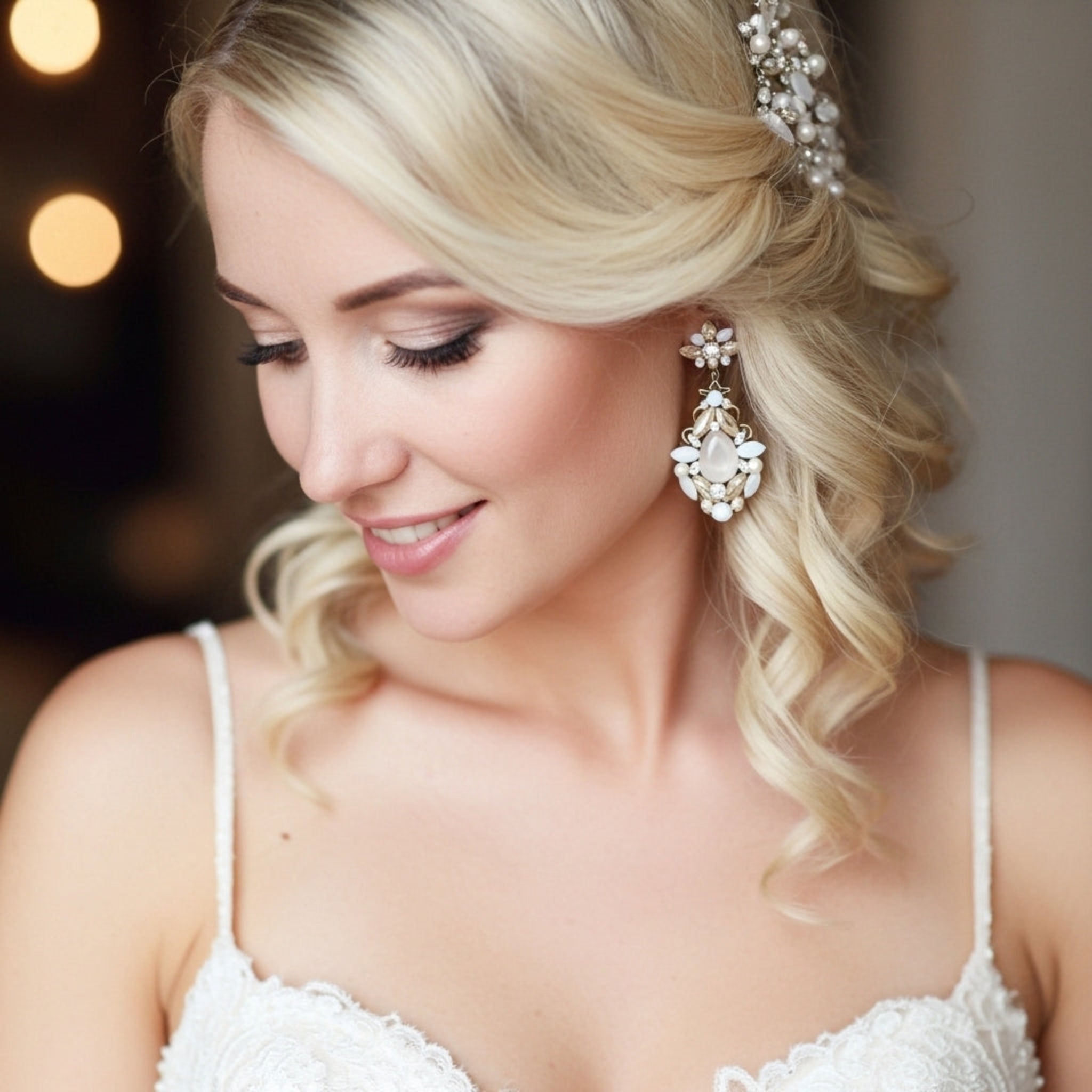 - Golden shadow, Ivory cream, clear and white opal stones with cream pearl accents