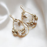 Handcrafted to order, our BROOKLYN earrings feature antique gold floral hoops adorned with delicate freshwater pearls and stunning Austrian golden shadow crystal rock fabric leaves. The perfect statement piece for a bridal look or special occasion, adding a touch of elegance and sophistication.