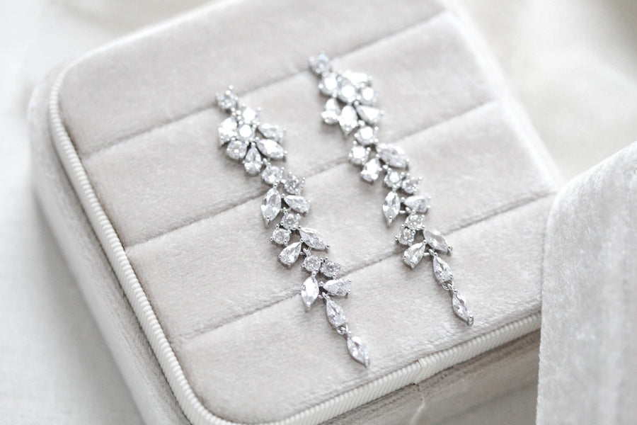 Our Long rose gold cubic zirconia Bridal earrings are created with rose gold plating over brass, Cubic Zirconia components in a long vine design.