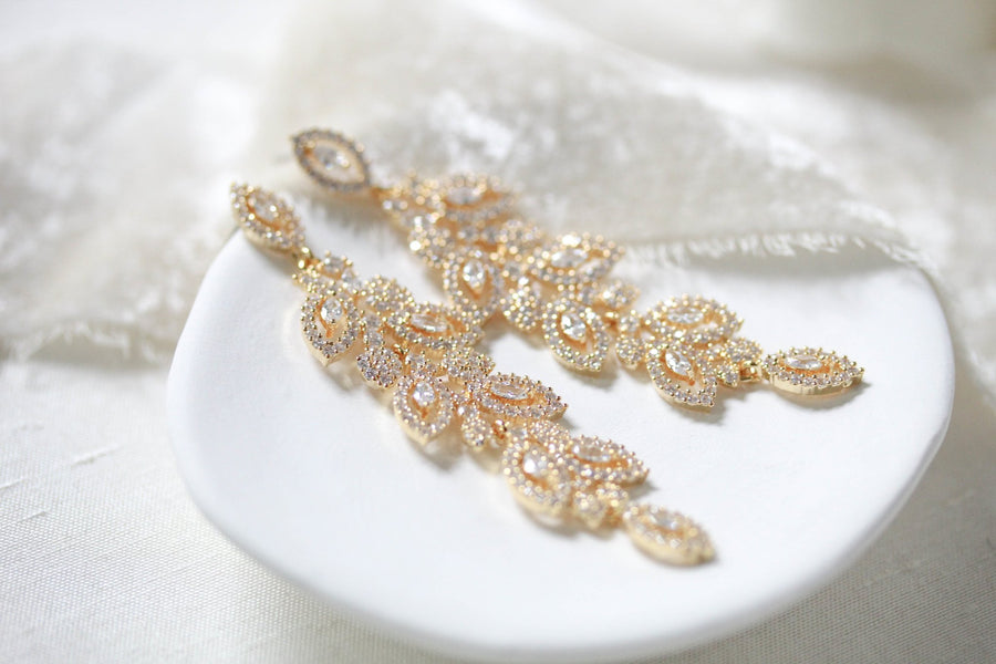 Long Rose gold Cubic zirconia Leaf Bridal earrings - MICHELLE - Treasures by Agnes